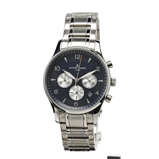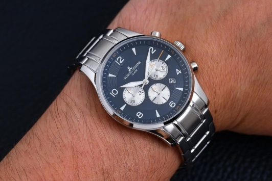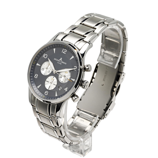Темно - синий структурированный циферблат привлекает внимание сочетанием арабских цифр и рисок, а также дополнительными счетчиками хронографа, окном даты.