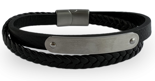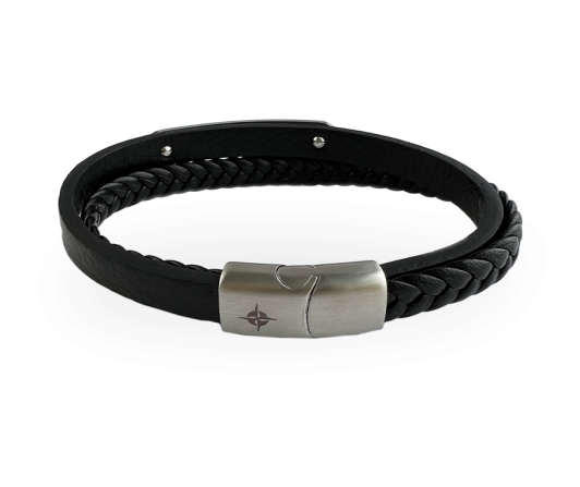 Браслет состоит из двух ключевых частей, которые подчёркивают его эксклюзивность. Первая часть — это плоский кожаный ремешок, который обеспечивает комфорт при ношении и придаёт браслету строгий, лаконичный вид. Вторая часть — плетеный кожаный шнур, добавляющий изделию текстурности и глубины, создавая тем самым визуальный интерес и динамизм в составе аксессуара.