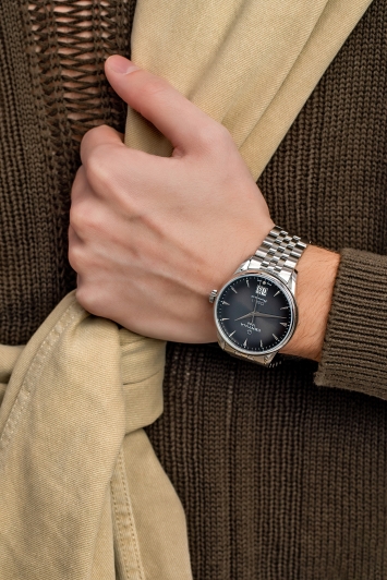 Под прочным сапфировым стеклом с антибликовым покрытием расположен черный сатинированный циферблат с окошком даты в положении 6 часов. Корпус и браслет часов изготовлены из нержавеющей стали: это очень прочный материал, который почти не подвержен ржавчине, потускнению и коррозии. Спираль баланса NivachronTM защищает от воздействия магнитных полей, перепадов температур и ударов.