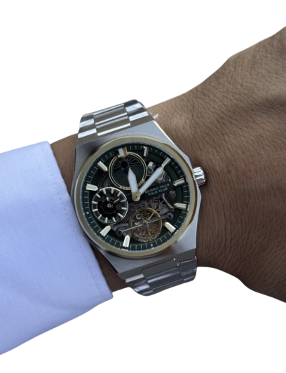 Сердцем этих часов является механический механизм с автоподзаводом, позволяющий наблюдать за его работой через эффектный циферблат "скелетон" насыщенного зеленого цвета. Частичное IP-покрытие цвета желтого золота придает корпусу и браслету из нержавеющей стали благородный блеск и изысканность.