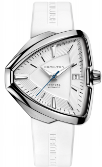 Швейцарские механические наручные мужские часы с автоподзаводом Hamilton Ventura Elvis80 Auto H24505311 на каучуковом ремешке посвящены легендарному бунтарю и горячему поклоннику часов Ventura – Элвису Пресли.