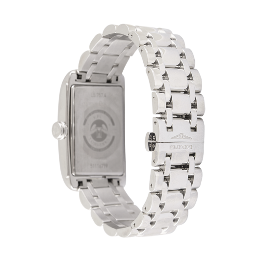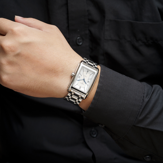 - циферблат серебристого цвета с вертикальным сатинированием, декорированный в стиле “ар деко”;